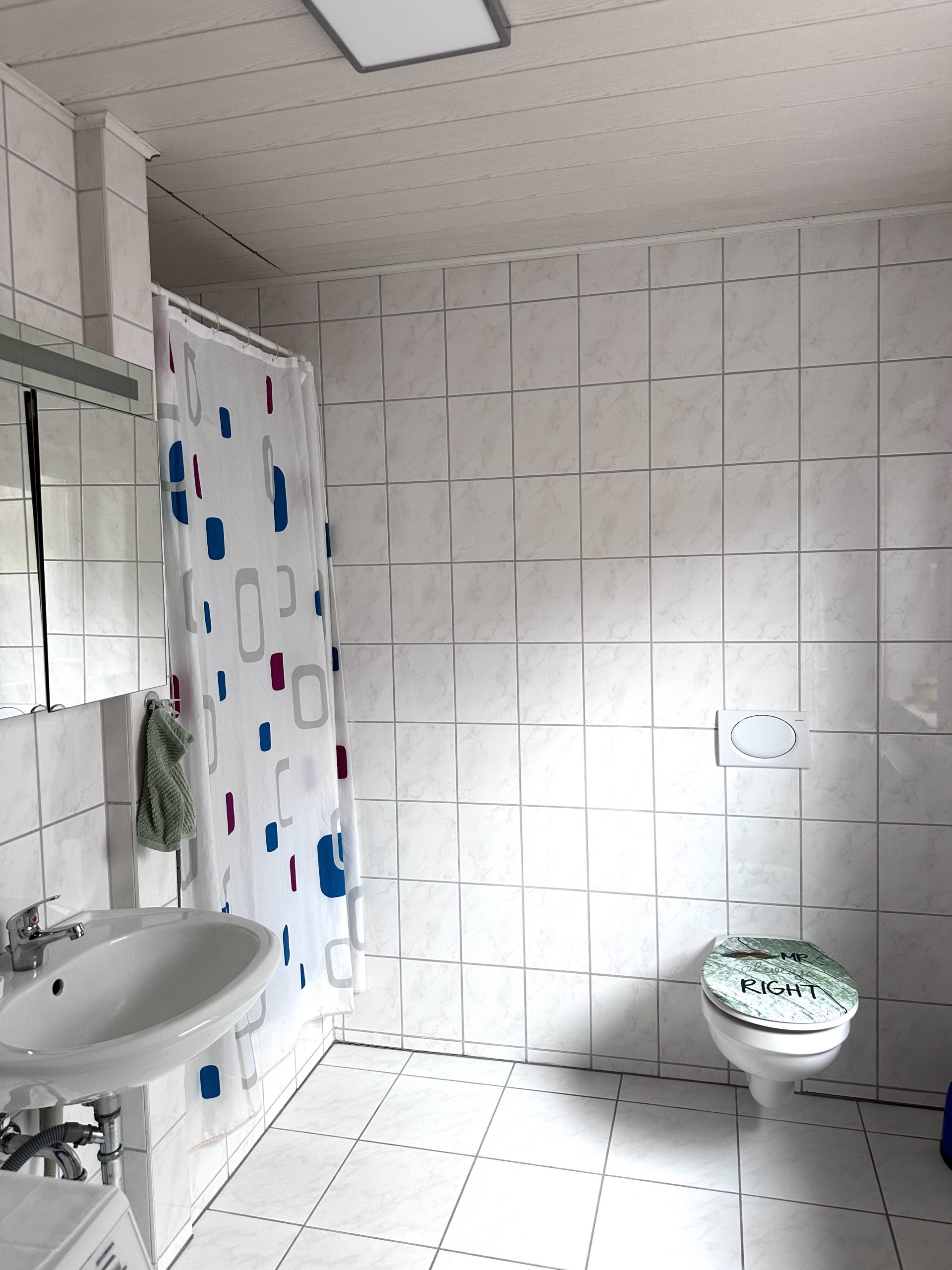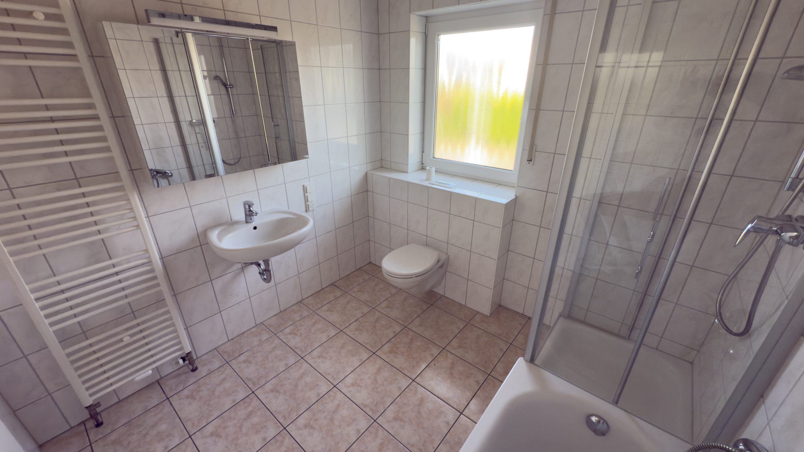 Im Erdgeschoss befindet sich des Weiteren ein Gäste WC sowie drei Schlafzimmer und das hell geflieste Tageslichtbad mit Dusche und einer Badewanne.